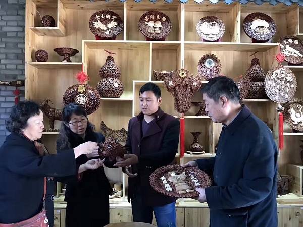 到黄陵后,车未停,人未休息。在县老促会会长贾永录陪同下直接前往双龙镇索罗湾行政村“黄陵乾锦和山核桃工艺品有限公司”进行考察。在公司经理赵崇斌引导下,先是参观了山核桃手工艺品展览室,不起眼的山核桃经过匠工们切割、打磨、造型、粘贴等三十多道工序精雕细刻,手工制作成“轩辕黄帝像”、“乾坤球”、“花瓶”、“镇宅斧”、“宝剑”、“大小烟灰缸”、“抽纸盒”、“手杖”、“牛、羊、鱼”等五十多种产品,琳琅满目。每件作品精巧玲珑,动物栩栩如生,既有实用功能,又有观赏价值,令人赏心悦目。随后参观了制作车间,还有利用当地山石制作的“假山”、“青苔”等。董总一行人看了赞不绝口,认为作品很有经济价值。她表示回北京后,要利用“中国扶贫开发有限公司”电商平台向全国各地和有联系的十多个国家推介“山核桃手工艺品”。同时指出产品包装档次低,建议探讨开发新的作品及精致的包装盒子,提高产品包装档次和质量,取得更好的经济效果。